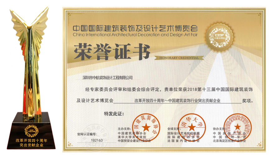 ? ? ??近日,由中國建筑裝飾協會與清華大學美術學院聯合主辦的第十三屆中國國際建筑裝飾及設計藝術博覽會在北京國際會議中心舉行,在本次博覽會上,中航裝飾被授予“改革開放四十周年~中國建筑裝飾行業突出貢獻企業”稱號,中航裝飾集團石英董事長被評為“改革開放四十周年~中國建筑裝飾行業突出貢獻企業家”。