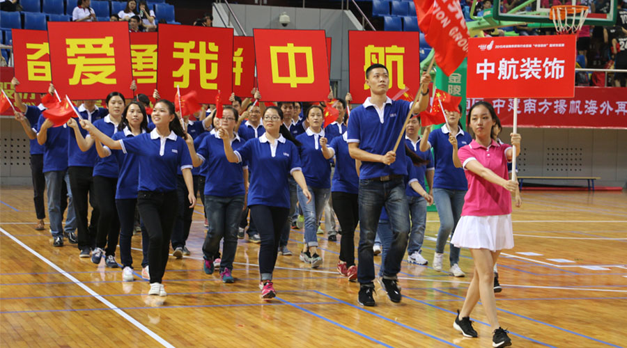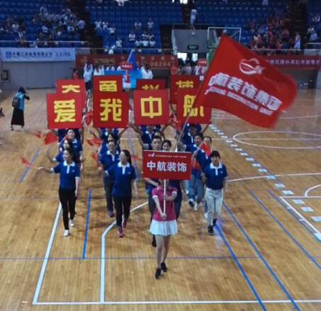 開幕式熱鬧有序進行,首先進行的是請會旗和傳遞會旗活動,接著是各代表隊方陣入場和各參賽籃球隊亮相。在現場熱烈的歡呼聲中,中航裝飾30人的方陣隊伍在舉牌禮儀、護旗手的帶領下邁著整齊堅定的步伐,昂首挺胸,步入會場,并喊著高昂嘹亮的口號“愛我中航 奮勇拼搏”經過主席臺,接受檢閱。
